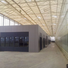 Om de nabij de 500 m2 aan kantine, kantoren, kleedruimtes en toiletten gerealiseerd voor een 100 arbeidsmigranten die daar werkzaam zijn in de kas. Ontwerp door TAB Vision gemaakt